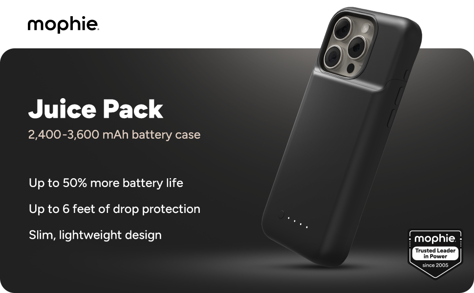 The juice pack provides power, capacity, and protection for your iPhone 15. The juice pack protective case contains an internal 2,400mAh battery, and it provides up to 6 feet of drop protection. Talk, listen to music, and view content on your phone without worrying about running out of battery. Just press and hold the button to send power directly to your phone.