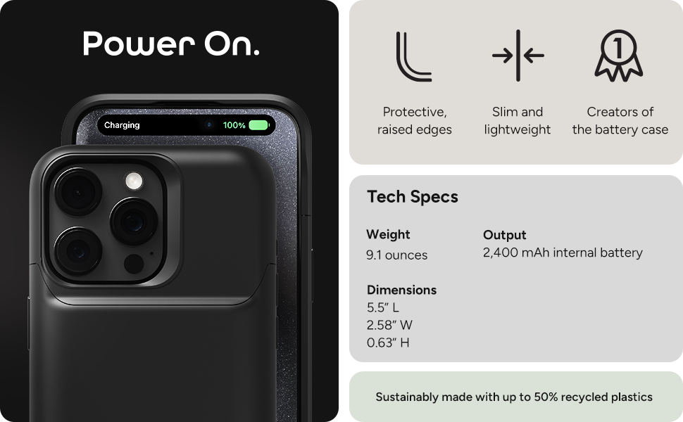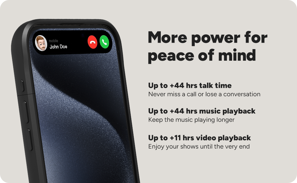 1Extra percentage battery life are estimates calculated comparing the stated power capacity of the internal power bank battery with those stated by manufacturer of the iPhone 15. The actual percentage of extra battery depends on a variety of factors that are different for every user.