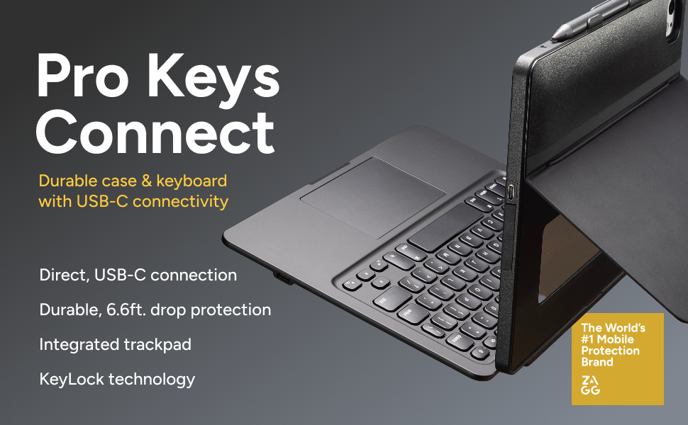 Pro Keys Connect keyboard & case connects directly with your iPad via USB-C. No Bluetooth® needed. It also has a trackpad for scrolling, laptop-style keys, a kickstand, an additional USB-C port, and a stylus holder. Pro Keys Connect brings the ultimate laptop experience to your iPad.