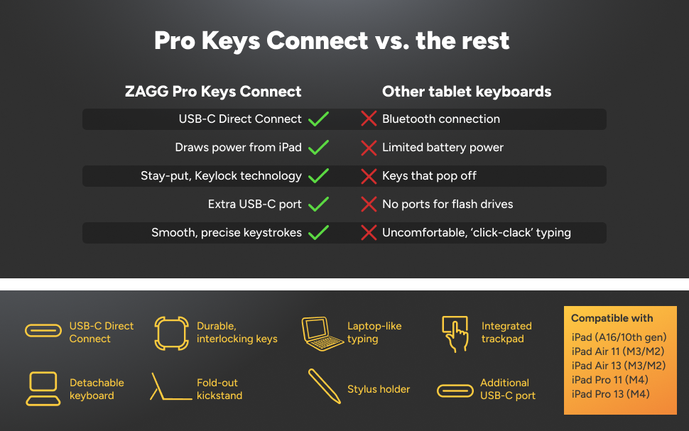 - USB-C Direct Connect: Pro Keys Connect draws power from the iPad—no Bluetooth, batteries, or keyboard charging required.